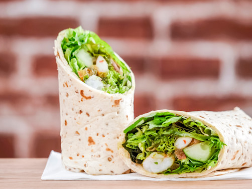 以羅勒醬為大蝦提味,配上青瓜、蕃茄及什生菜,一卷盡嚐意式風情!