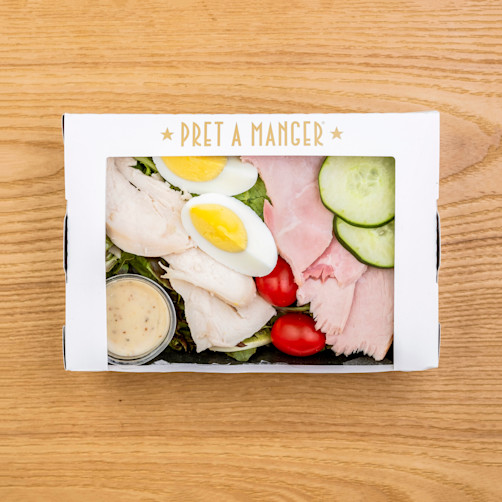 此款完美搭配的沙律選用雞肉、火腿、車厘茄、青瓜和水煮蛋,以及新鮮什生菜,拼配上法式沙律汁;輕盈又滋味!