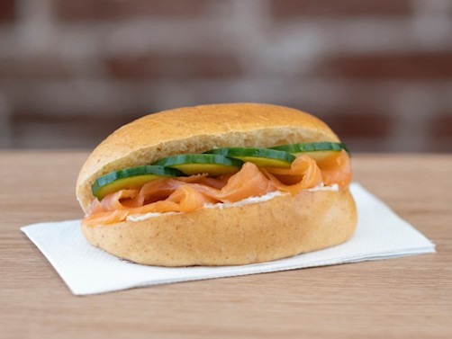 我們的招牌全麥法式軟包配上蘇格蘭煙三文魚、青瓜、蛋黃醬。